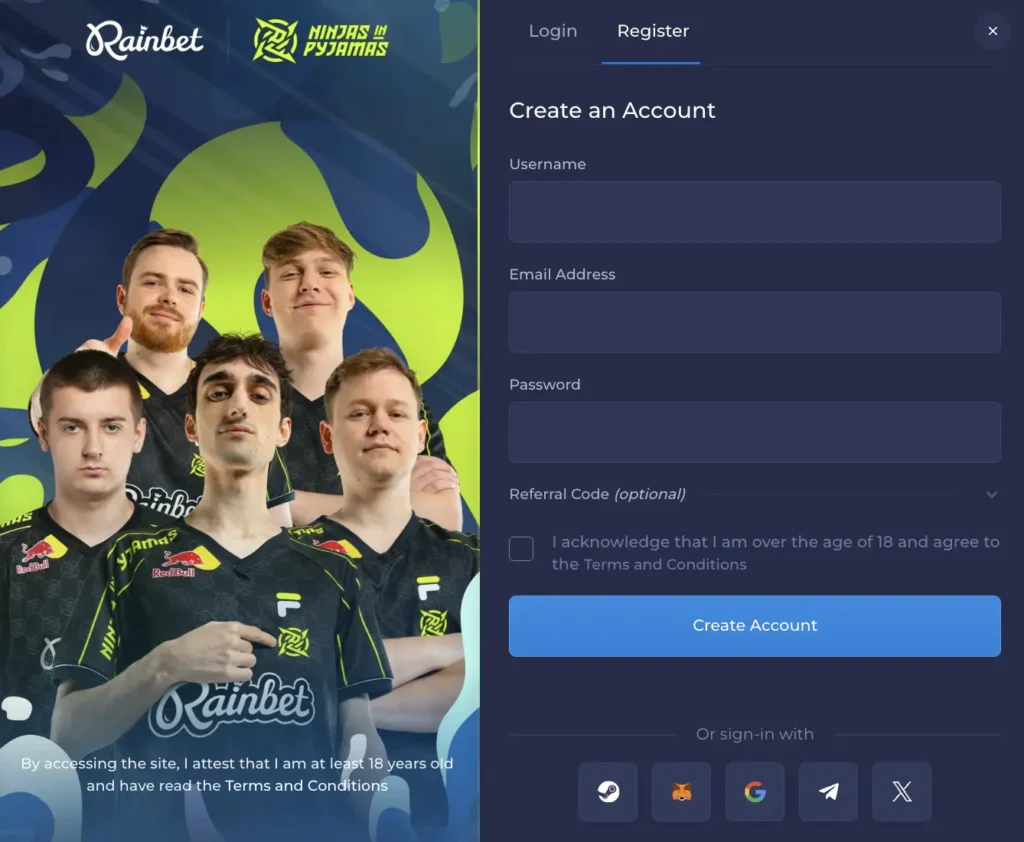 Alternatively, you can register by using your existing social media accounts like X, Steam, Telegram, Metamask, and Google. For both options, it will take less than two minutes to complete the process and you can start playing.